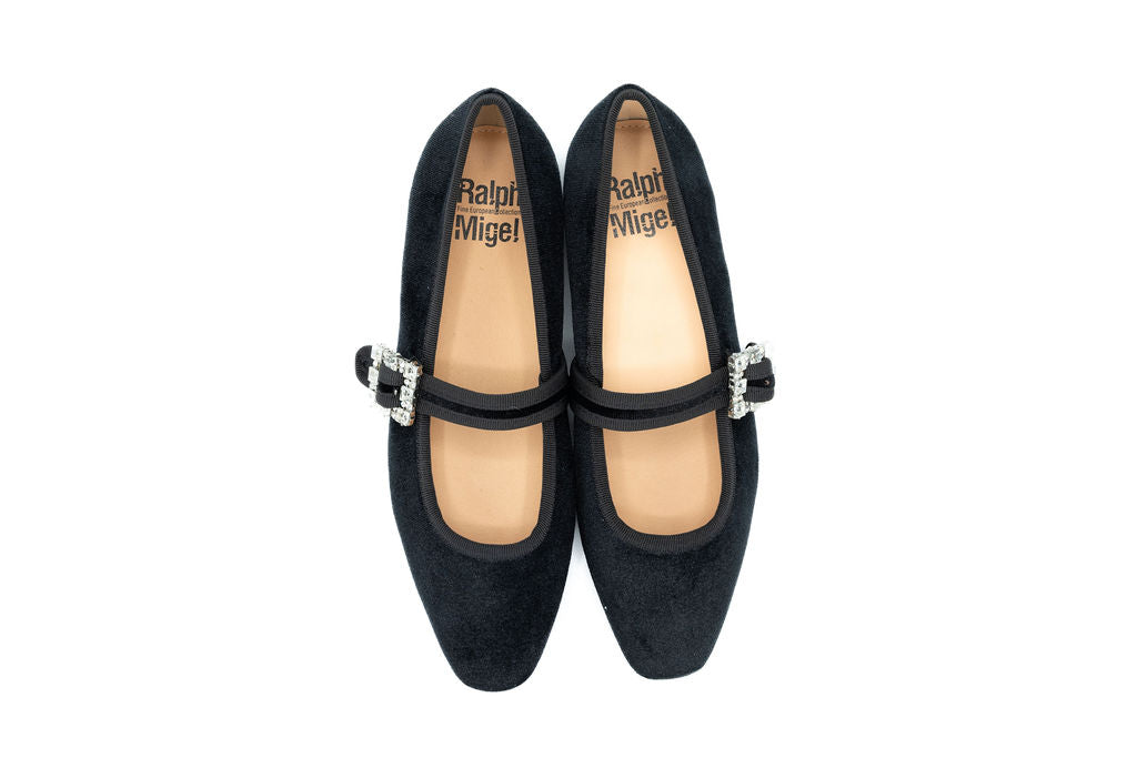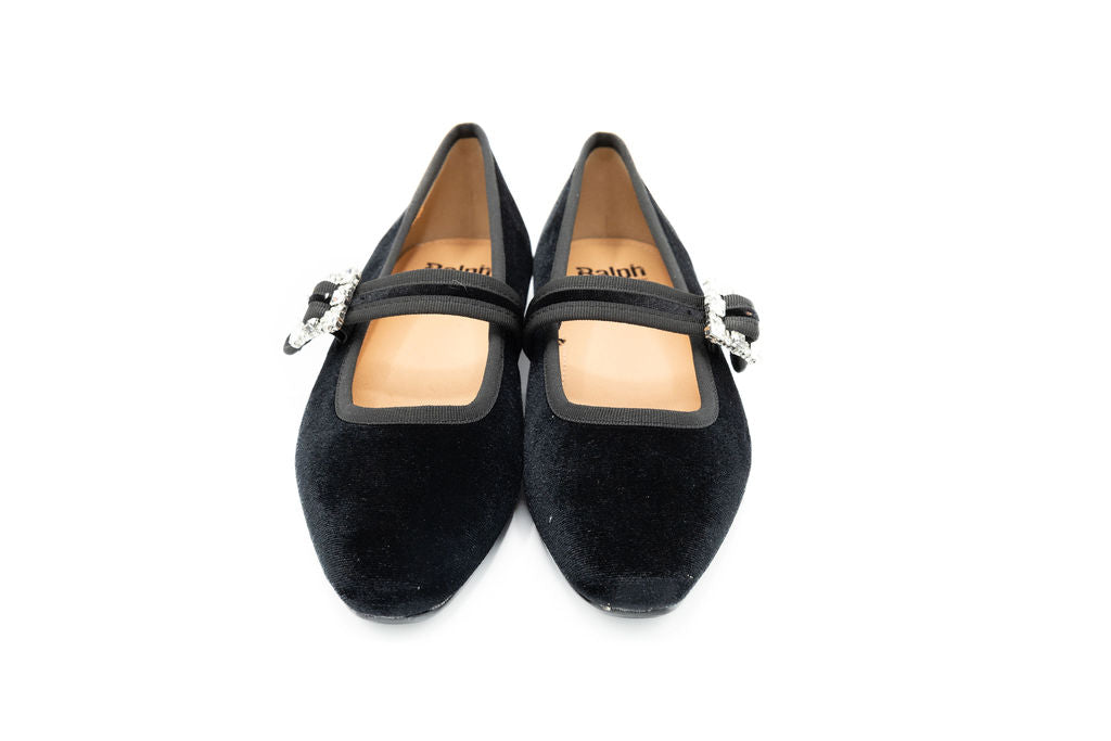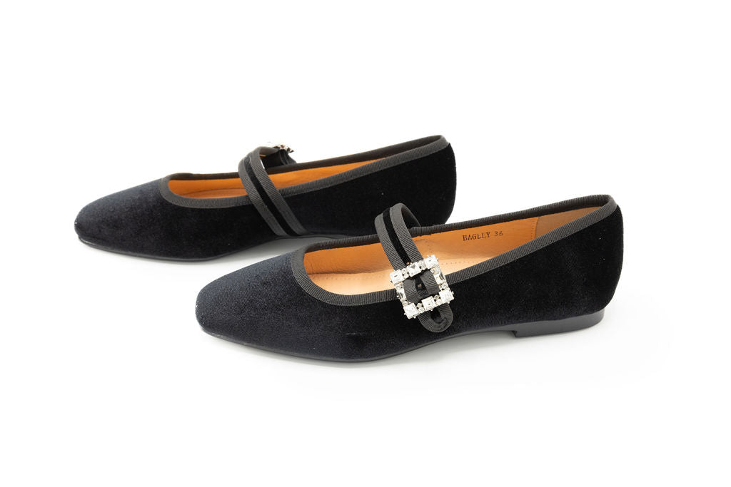Elevate your fall style with our Bailey a chic update to the classic silhouette. Crafted in smooth velvet, this flat features a modern square toe and a statement strap adorned with a sparkling diamond emblem. The mix of timeless design and refined detailing makes it a standout piece for both day and evening wear. Sophisticated yet versatile, it’s the perfect flat to add a touch of elegance to your fall wardrobe.