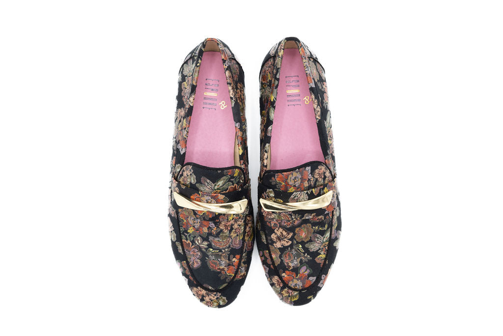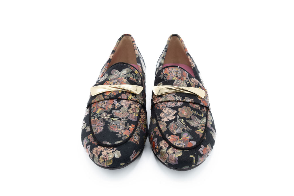 Classic meets contemporary in our Ira Loafer, designed for the Fall Collection. Crafted in soft floral print, this loafer brings seasonal texture to a timeless silhouette. A gleaming gold emblem at the front adds a refined touch, balancing everyday wearability with elevated style. Perfect for pairing with dresses, skirts, or denim, it’s a versatile flat that transitions seamlessly from day to night.