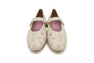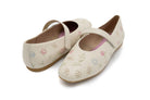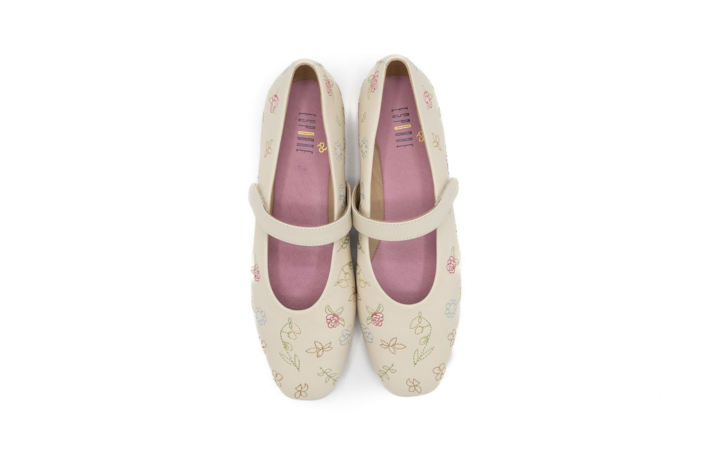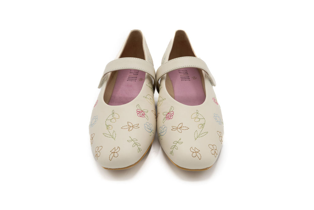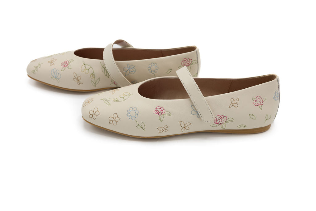 Step into spring with effortless charm in this sweet, feminine flat. Designed in a soft cream hue, this Mary Jane silhouette features delicate multicolor floral embroidery scattered across the upper for a fresh, garden-inspired feel. The rounded toe and smooth finish give it a timeless look, while the subtle pink lining adds a playful touch.
