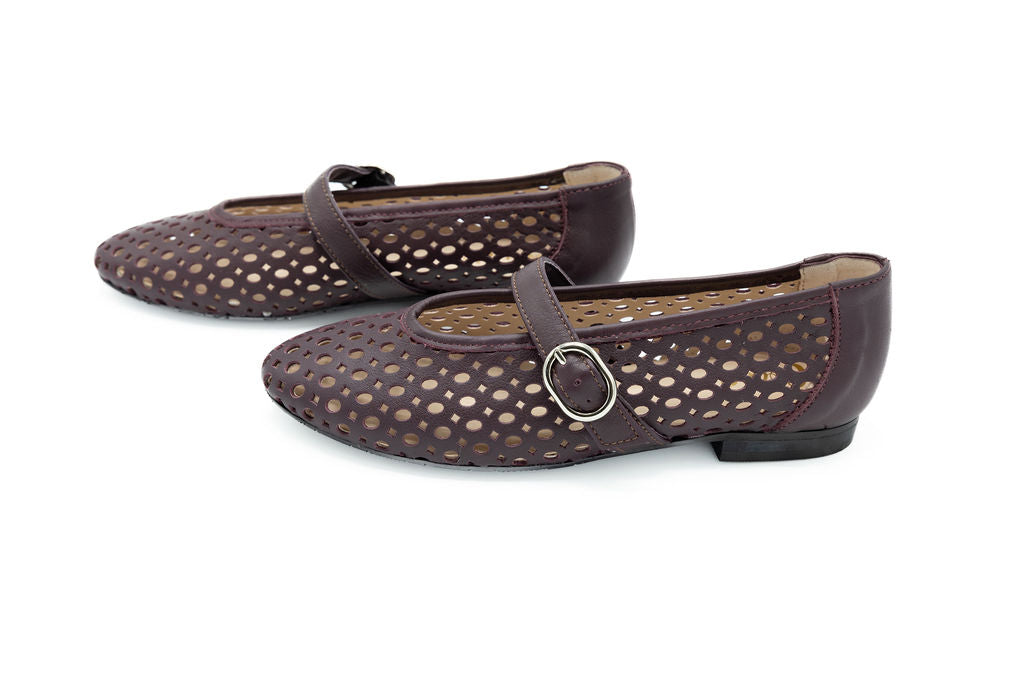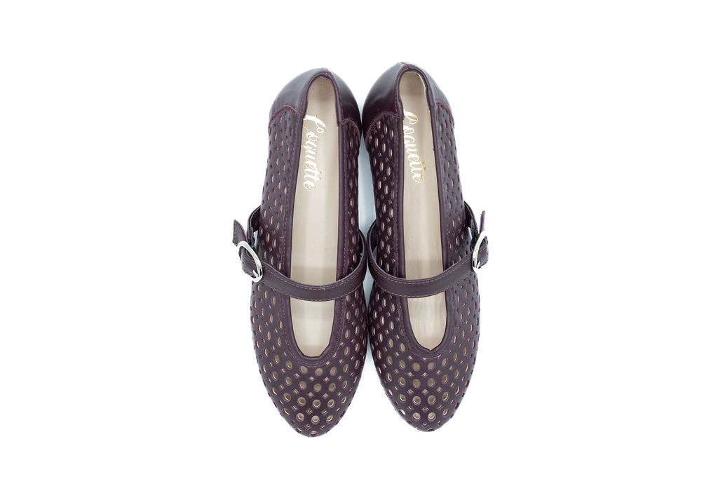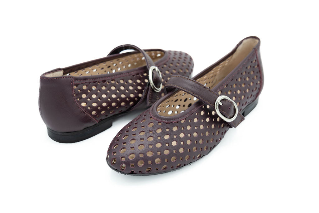 Embrace the color of the season with this burgundy Mary Jane flat, designed with delicate perforated detailing and a polished buckle strap. The classic silhouette gets a modern update with its rich hue and textured finish, while the secure buckle offers both style and function. Perfect for everyday wear, this flat adds a chic pop of color to your fall wardrobe.