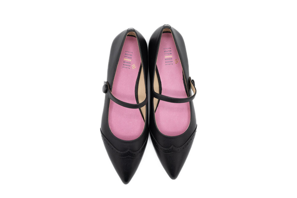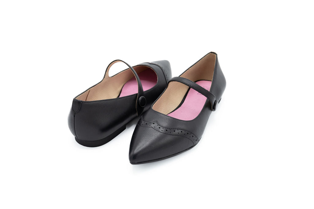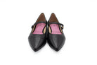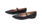 Elevate your fall wardrobe with this sleek black leather Mary Jane flat. Designed as a slip-on with a pointed toe, it combines classic sophistication with modern ease. The smooth leather finish adds polish, while the Mary Jane-inspired silhouette keeps it timeless and versatile. Perfect for everyday wear, from office looks to casual fall outfits, this flat is a stylish essential for the season.