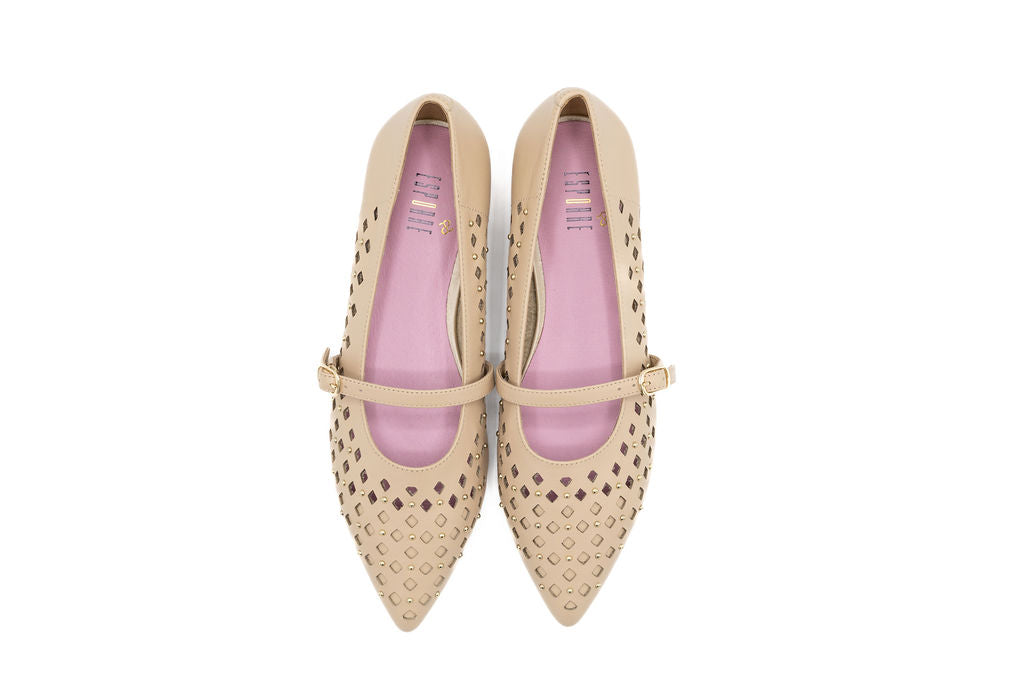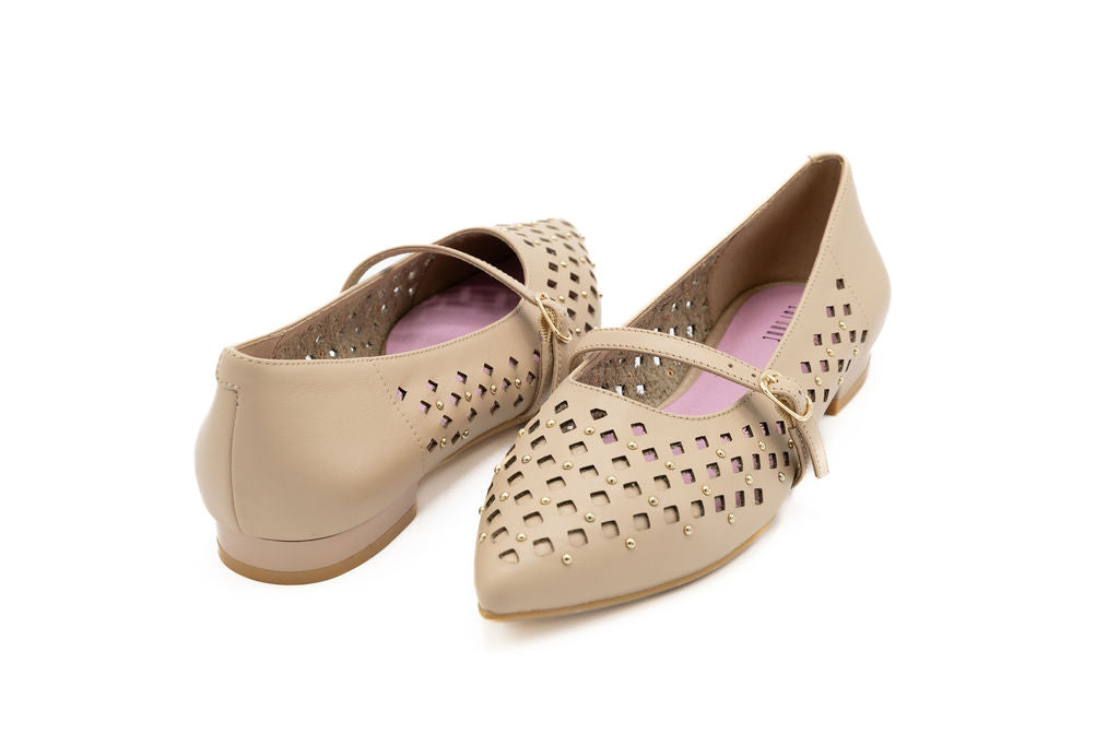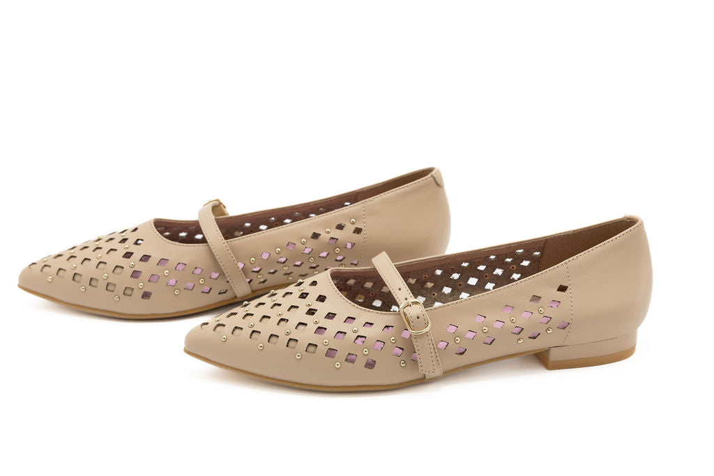 The Alex Light Nude Perforated Leather flat brings effortless sophistication to your spring wardrobe. Featuring a sharp pointed toe and striking nailhead details, this design balances minimalist charm with modern edge. Breathable perforations keep your feet cool, while the sleek nude tone pairs with everything. A versatile essential that is perfect for the Yom Tov/Spring season.