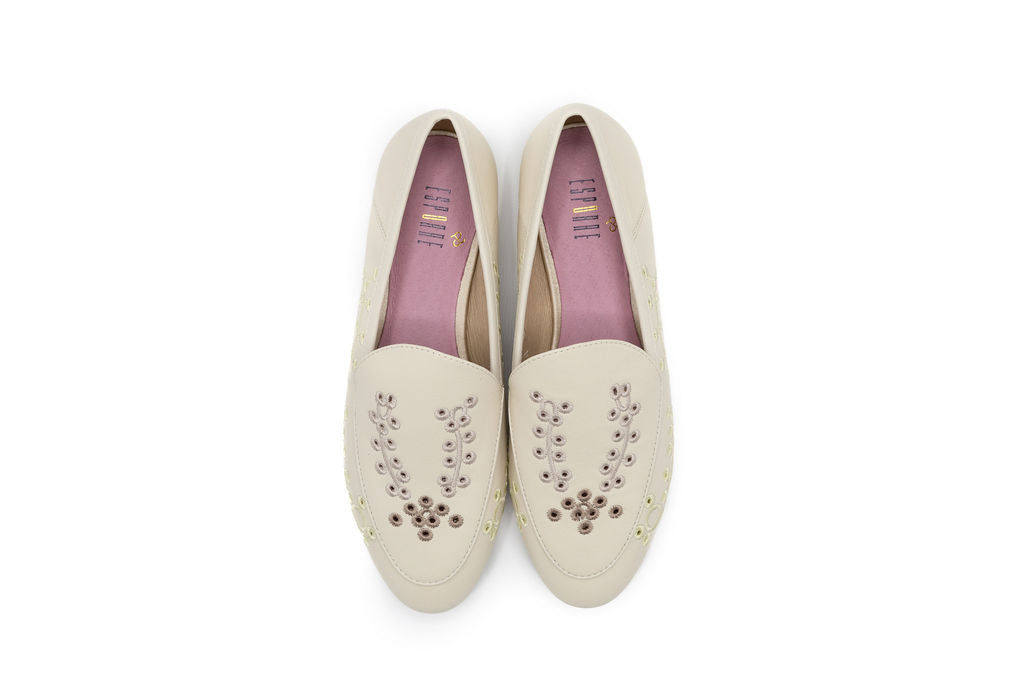 Elegant and understated, the Soft Ivory loafer is the perfect neutral for spring. Crafted in a creamy ivory tone with delicate tonal floral embroidery, this style gives a soft, romantic touch without overpowering your look.