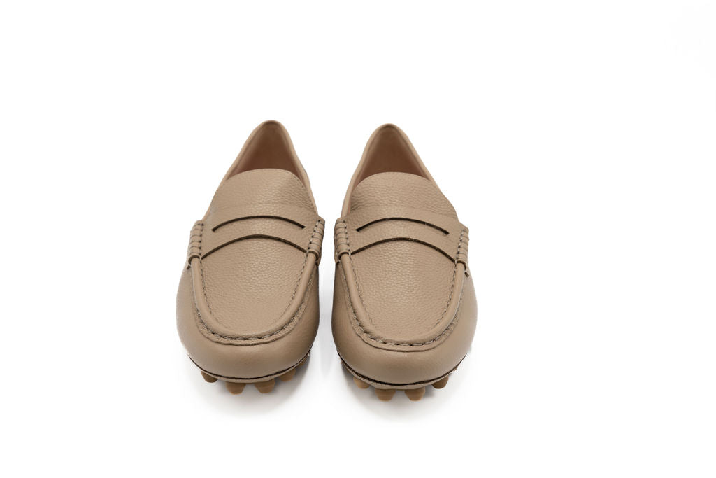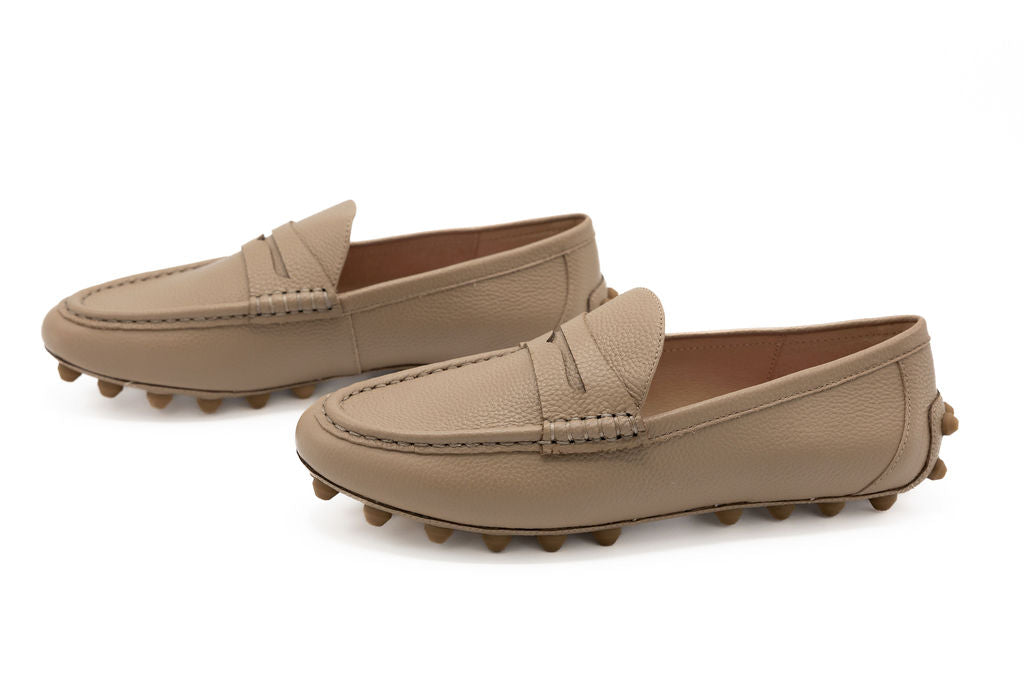 The Nole Taupe Granular Leather loafer brings effortless sophistication to your spring wardrobe. Crafted in rich taupe with a textured granular leather finish, this slip-on pairs seamlessly with everything from denim skirts to casual weekend wear. The standout feature is its specially designed bumpy sole, engineered for superior traction and stability on any surface. Whether you're navigating wet pavement or polished floors, you'll move with confidence and grip. The cushioned footbed ensures all-day comfort, while the classic loafer silhouette keeps your look refined and timeless. Perfect for transitional weather, this versatile essential bridges the gap between seasons with understated style and practical performance.
